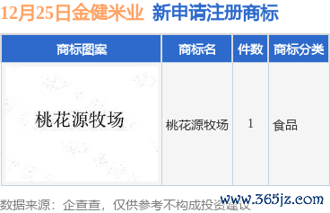 证券之星消息2024股票配资,根据企查查数据显示,近日金健米业股份有限公司新提交“桃花源牧场”商标注册申请。商标申请详情如下: